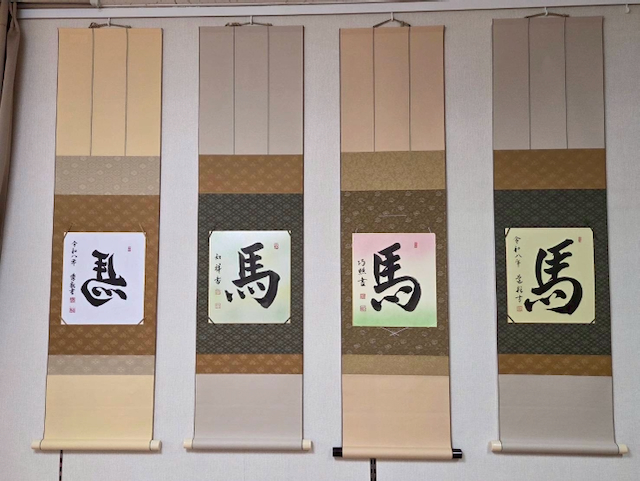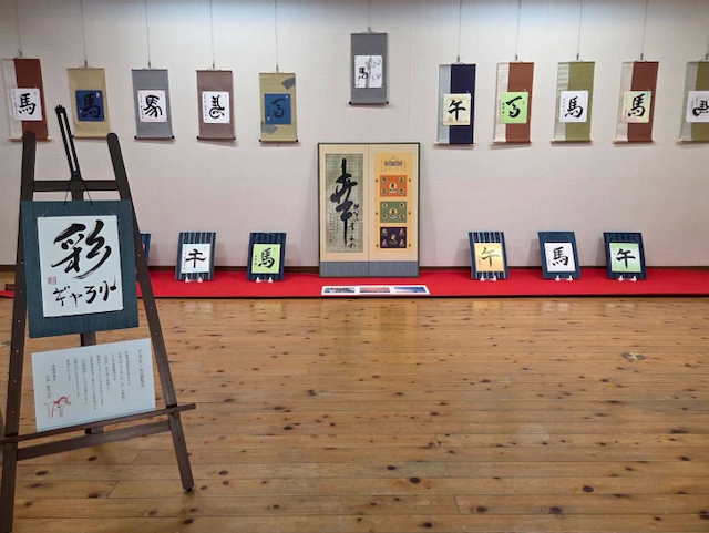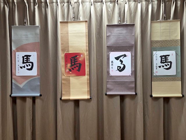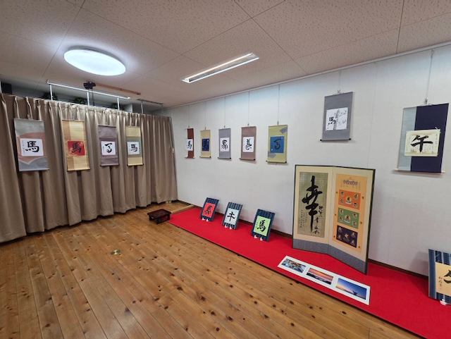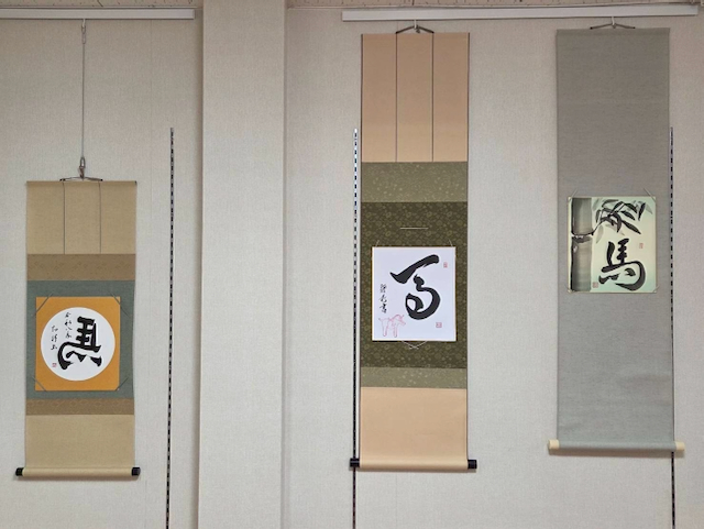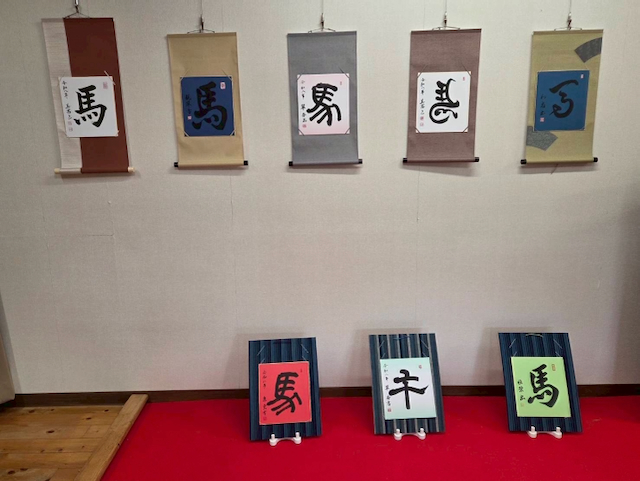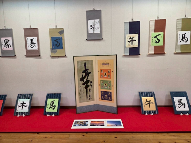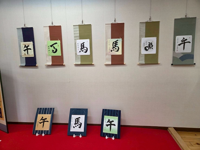 会場では、伊勢教室会員が思い思いの書体で揮毫した干支(午・馬)作品の色紙とともに、柏木白光の熊野古道シリーズの代表作も展示されています。