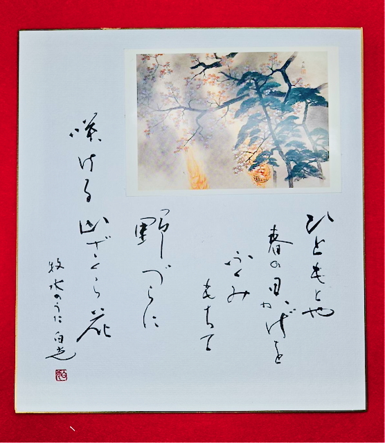 遠くにそびえる富士山にも野に立つ山桜が彩りを与えています。
